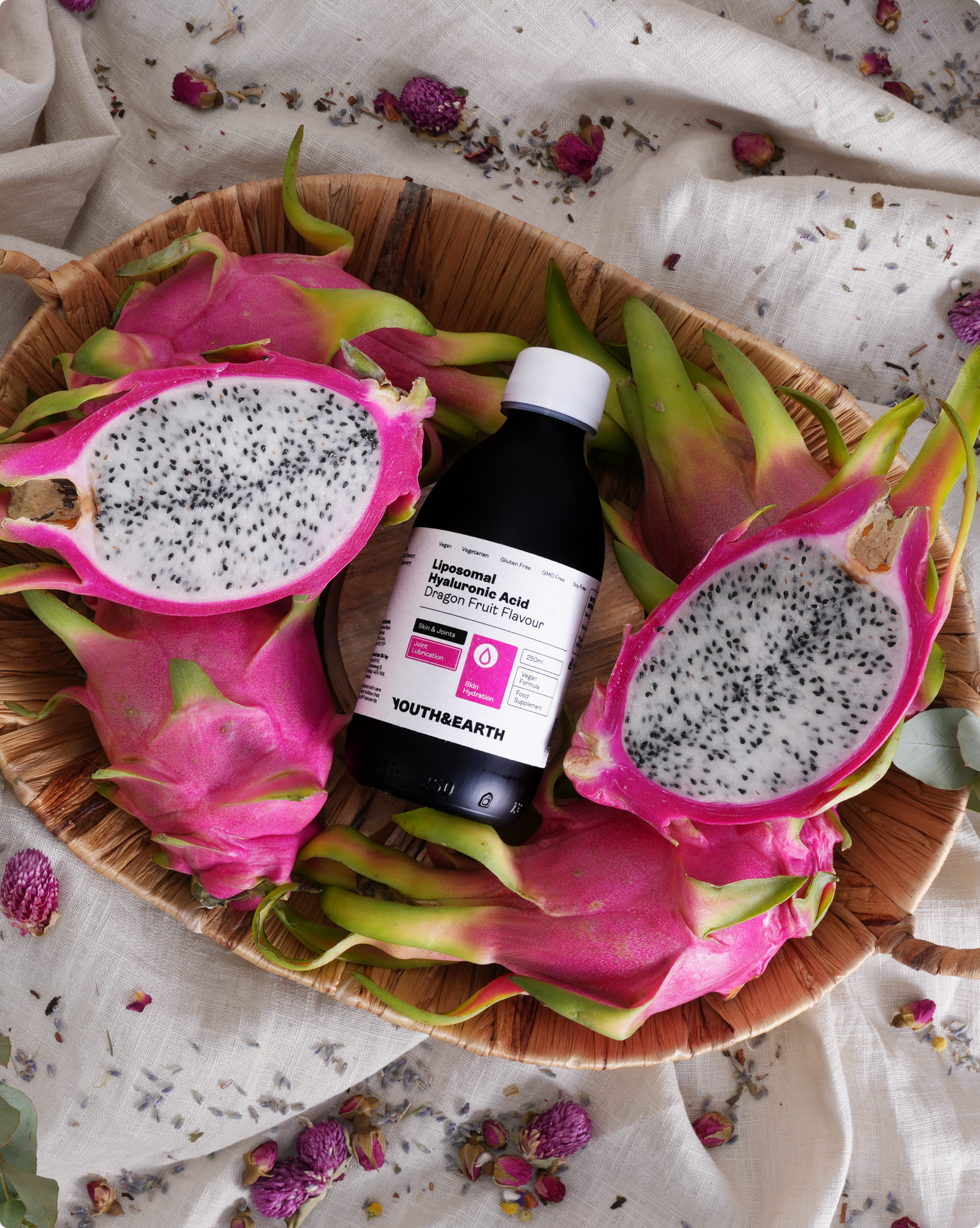 Ingredients : Purified water, Vegan Glycerol (natural stabiliser), Phospholipids, Hyaluronic Acid, Dragon Fruit flavour, Seabuckthorn extract (natural preservative), Rosemary extract (natural preservative), Malic Acid