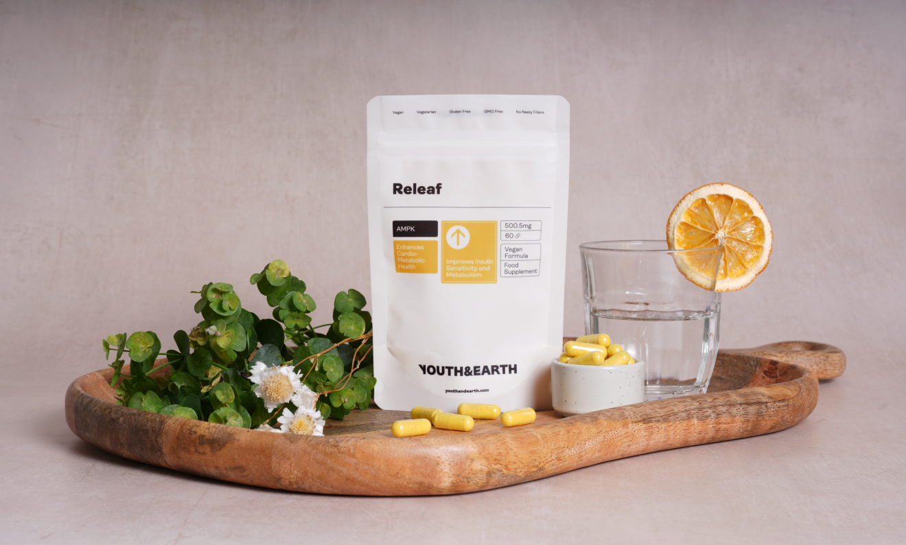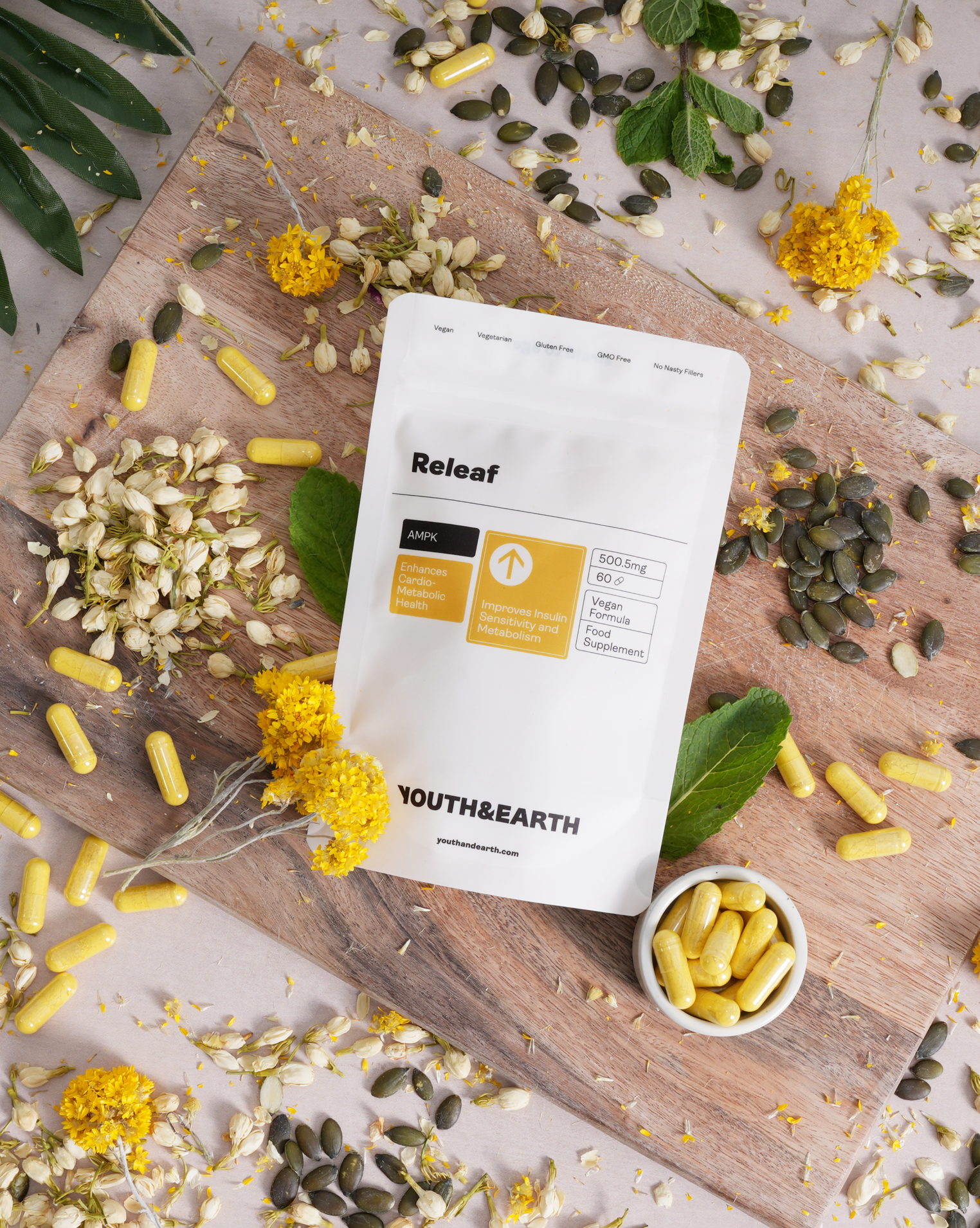 Releaf is an exclusive combination crafted specially for Youth & Earth to support metabolism and balance blood sugar levels. A rich source of Berberine, which activates the AMPK longevity gene — a key component of metabolic regulation. When combined with Silymarin, Berberine has also been shown to enhance cardiometabolic health. To support metabolism and balance blood sugar levels, RELEAF also contains highly absorbable Chromium Picolinate.