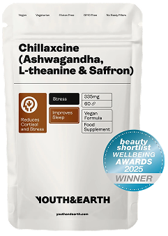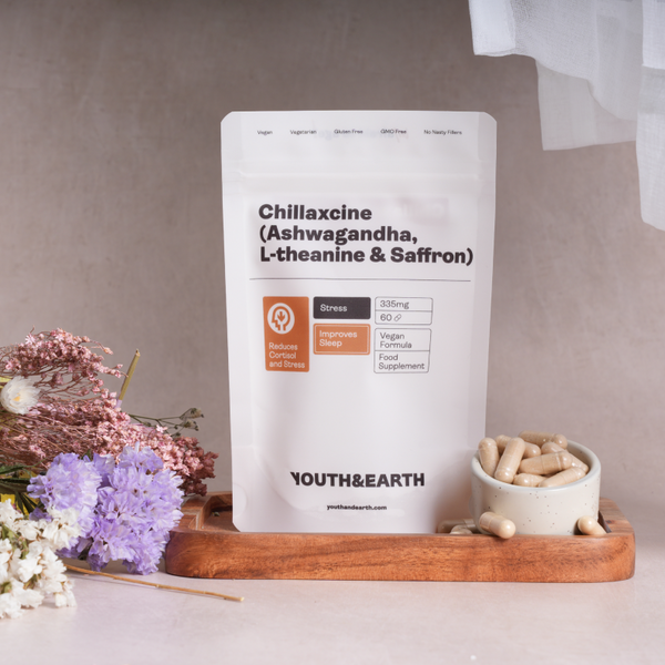 Chillaxine by Youth & Earth is an exlusive vegan-friendly stress-reducing supplement featuring highly bioavailable Shoden® Ashwagandha, L-theanine, and Affron® Saffron. It helps lower cortisol levels, provides anti-anxiety benefits, supports better sleep, balances metabolism, mood, and digestion, and fights free radicals with antioxidants.