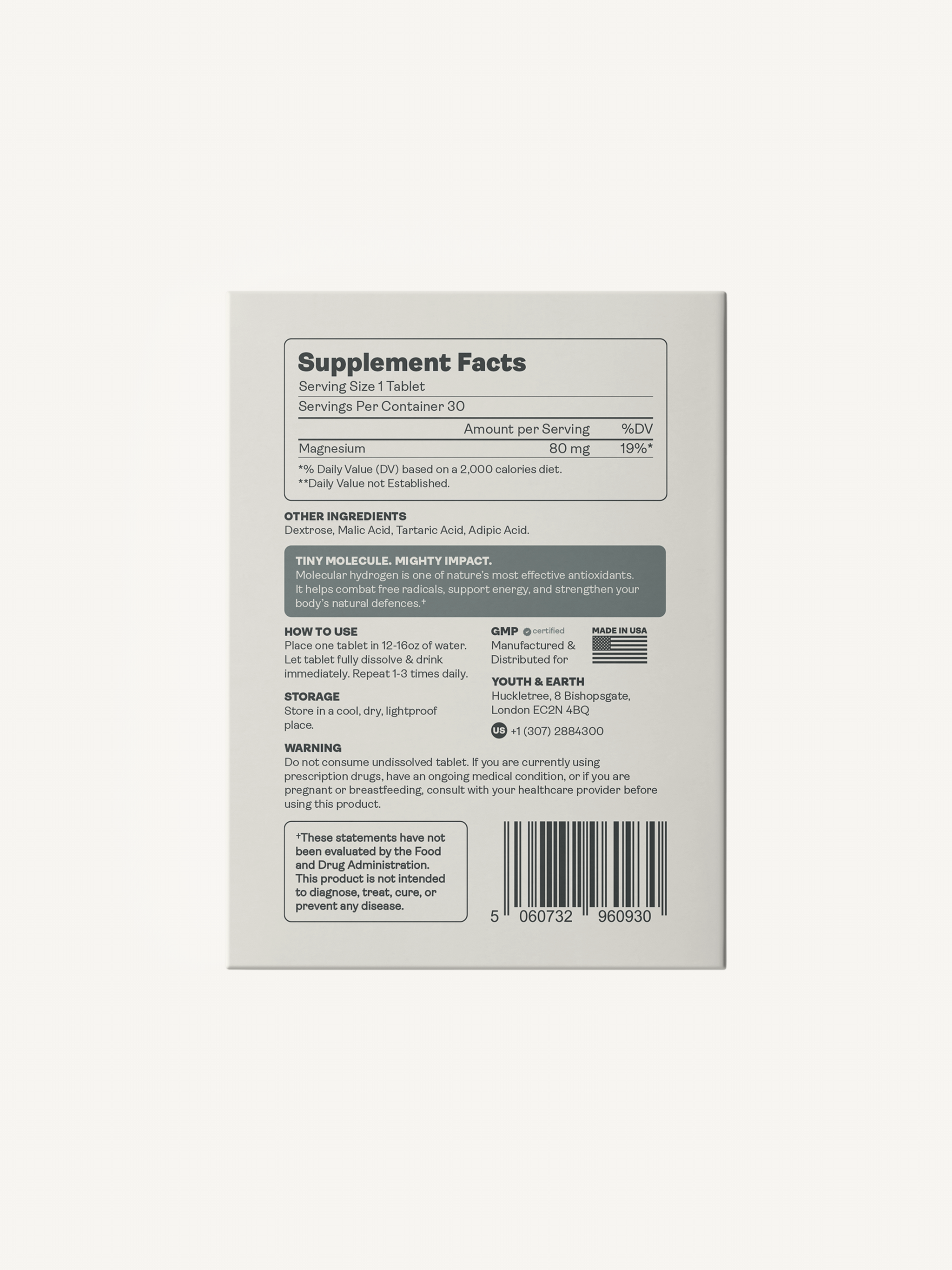 Each pack of Youth & Earth Hydrogen Tabs contains 30 fast-dissolving, magnesium-based tablets. One tab releases millions of H₂ nanobubbles, saturating your glass with molecular hydrogen - the smallest molecule in the universe.