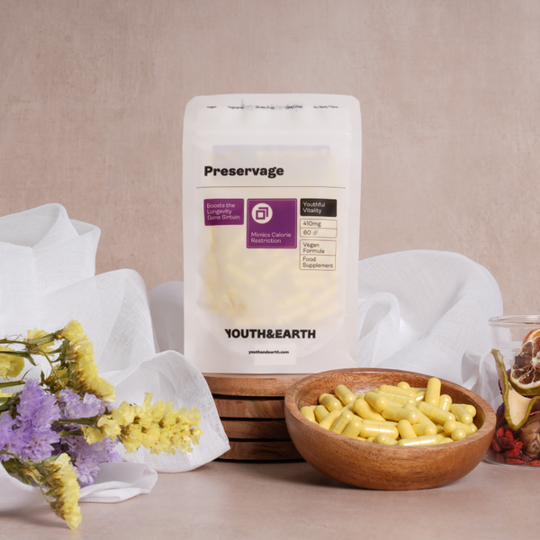 Preservage is Youth & Earth's award-winning unique, all-natural combination of Trans-Resveratrol, Curcumin, Quercetin, and BioPerine. This powerful combination was carefully crafted to optimise intestinal absorption of Resveratrol of up to 350% and Curcumin of up to 200%, allowing your body to experience enhanced natural benefits. This would equate to one serving of 900mg of Trans-Resveratrol, 658mg of Curcumin and 400mg of Quercetin. With a selection of polyphenols known to boost the longevity gene Sirtuin, it works deep within the body to help slow the ageing process naturally. This formula is, therefore, more potent than Resveratrol alone.