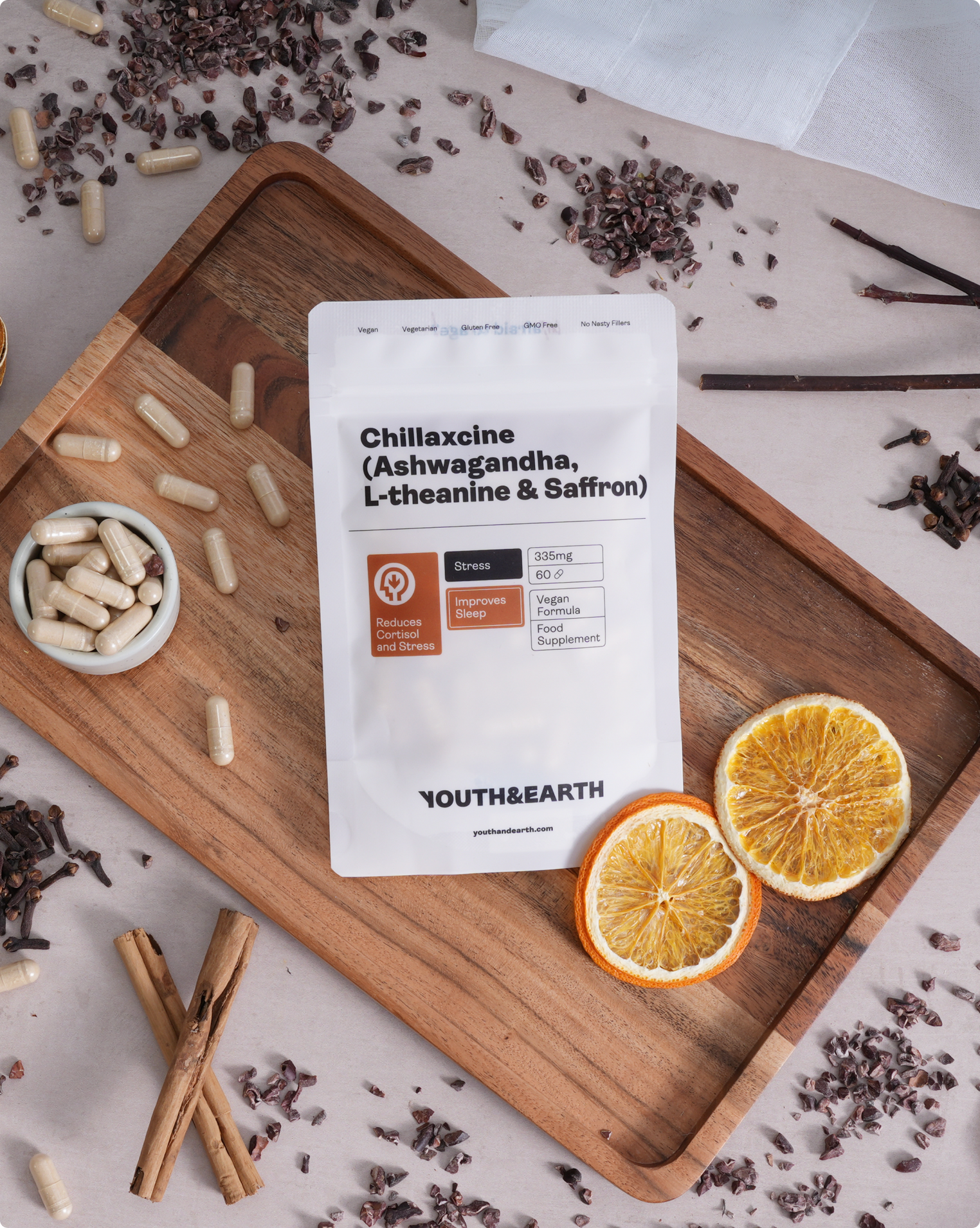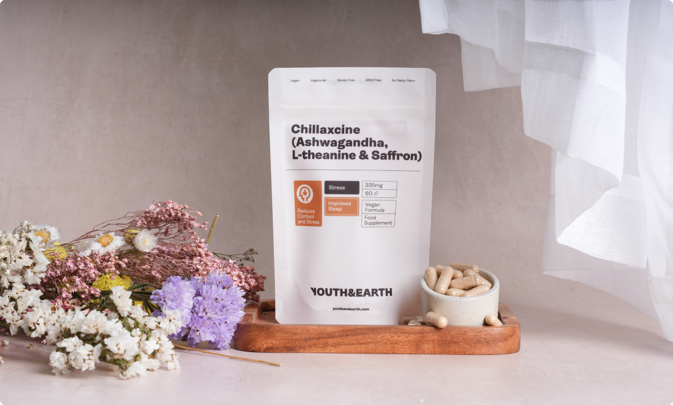 Chillaxine by Youth & Earth is an exlusive vegan-friendly stress-reducing supplement featuring highly bioavailable Shoden® Ashwagandha, L-theanine, and Affron® Saffron. It helps lower cortisol levels, provides anti-anxiety benefits, supports better sleep, balances metabolism, mood, and digestion, and fights free radicals with antioxidants.