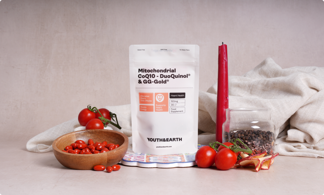 the Youth & Earth Mitochondrial CoQ10 supplement combines DuoQuinol® (Ubiquinol, an active form of CoQ10) with GG-Gold® (Geranylgeraniol) to naturally boost the body's production of CoQ10 and GG. This combination provides powerful antioxidant protection, supports cellular energy, and helps combat ageing. Ubiquinol offers higher bioavailability and absorption compared to ubiquinone, while GG enhances this effect and supports muscle function and strength.