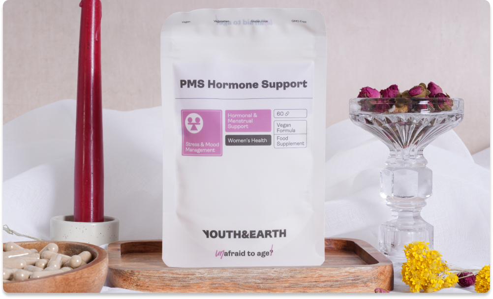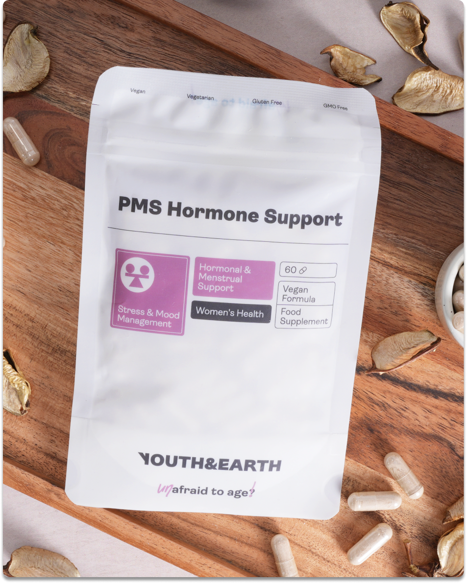 Youth & Earth's PMS Hormone Support stands out due to its comprehensive blend of high-quality, natural ingredients specifically chosen to support hormonal balance and alleviate PMS symptoms. It is vegan, gluten-free, and GMO-free, making it a safe and effective choice for managing menstrual cycle-related discomfort. It offers a natural alternative to medication, without the side effects. The Youth & Earth PMS Hormone Support is free from artificial fillers, colours and preservatives, proudly manufactured in the UK in a facility that follows cGMP standards.