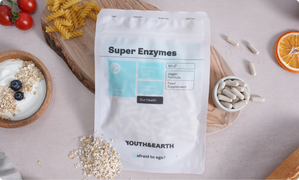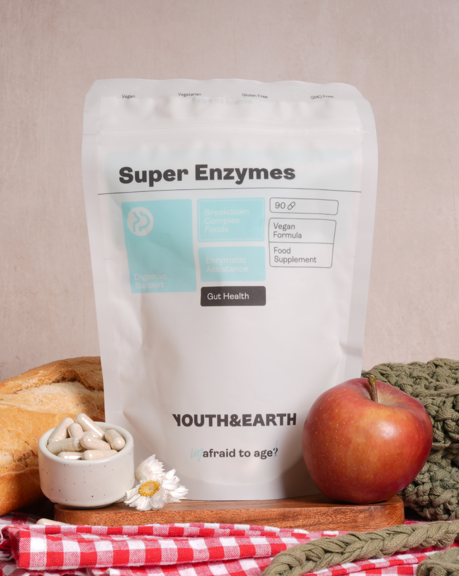 Super Enzymes by Youth & Earth are a comprehensive blend of digestive enzymes designed to support your body's ability to break down and absorb nutrients from your food. By enhancing the digestion of carbohydrates, fats, proteins, and fibres, Super Enzymes help to reduce digestive discomfort, improve nutrient absorption, and boost overall energy levels. Imagine enjoying your favourite meals without the post-meal sluggishness—Super Enzymes make it possible!