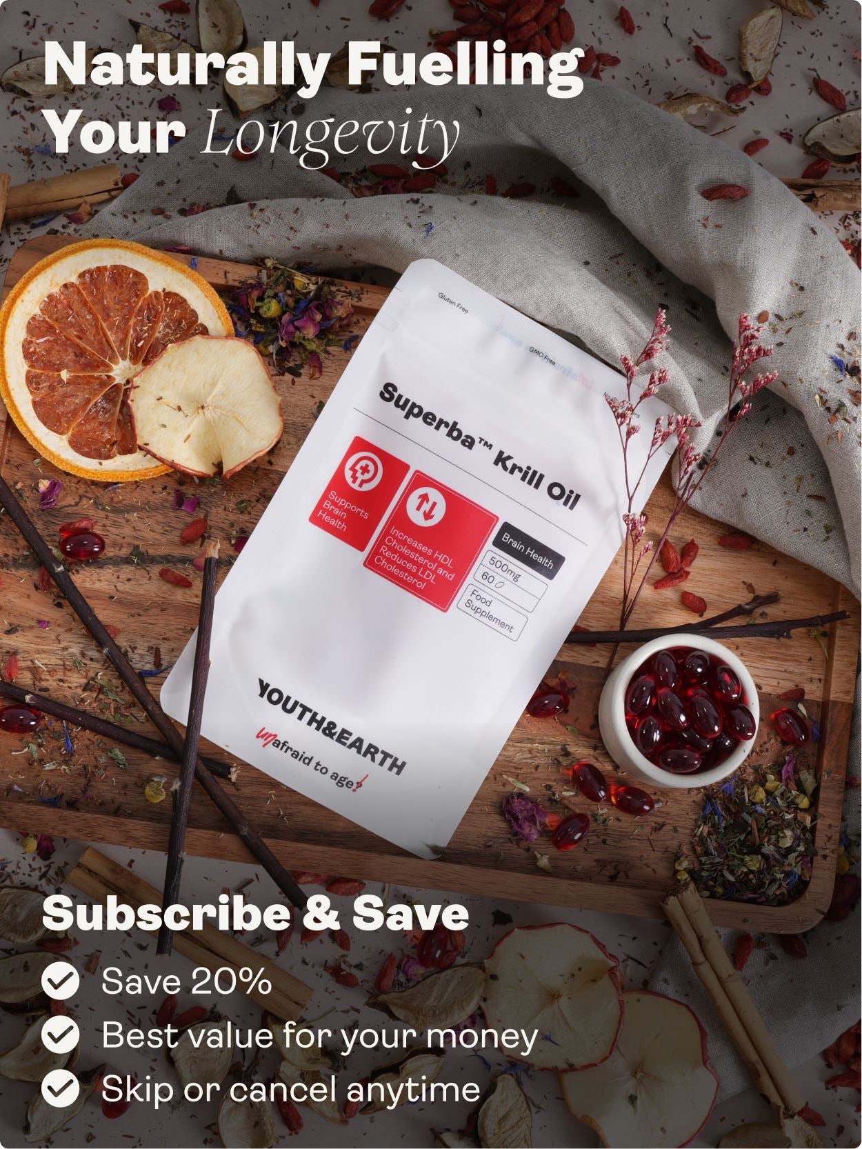 Krill Oil can help to reduce CRP-(C-reactive protein) - a key anti-ageing biomarker linked to inflammation and heart disease. It can also increase HDL, which is good cholesterol and reduce LDL - bad cholesterol. Krill Oil could aid in brain health to maintain proper cognitive function and may improve skin hydration and elasticity, leading to improved skin smoothness and softness. Krill Oil also plays a major role in supporting the immune system and promoting health of your eyesight and the flexibility of your joints.