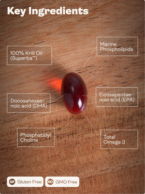 Krill Oil contains Omega 3 fatty acids. These essential fatty acids are one of the most researched nutrients, with a wide range of health benefits for your heart, eyes, liver and brain. It also contains Phospholipids - they are liposomes that help omega-3s integrate into the cell membranes and may be a better delivery form to the body’s organs than other marine oils increasing bioavailability. Krill Oil also contains Choline, which is an essential nutrient vital for many body functions such as nerve signaling, liver and muscle functioning. Our body isn't able to produce enough, therefore we must obtain it from our diet. Krill Oil is also rich in Astaxanthin, which is nature's most powerful natural
